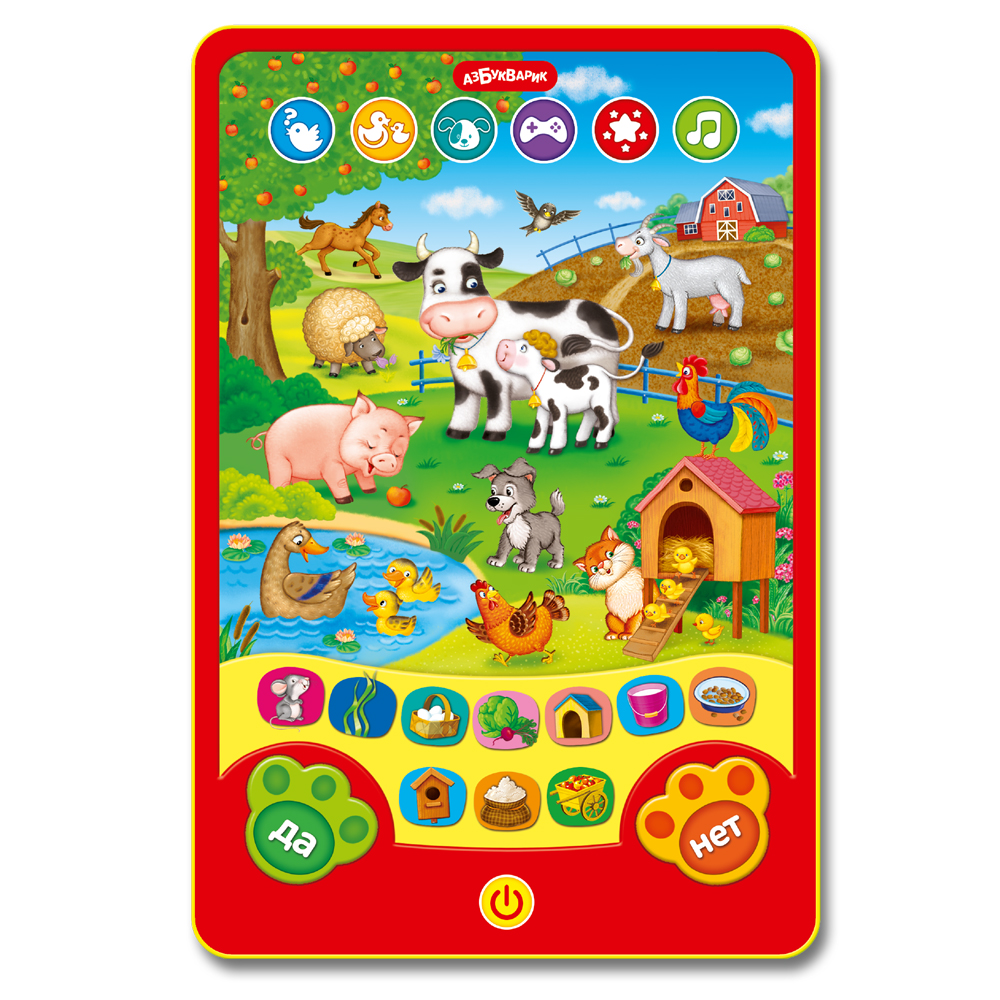 Планшетик «Весёлые игры на ферме» – это 80 вопросов, загадок, логических пар, 25 говорящих картинок, 15 зверюшек, 10 песенок, 5 игр («Чей голос?», «Найди пару», «Сочини сказку», «Загадай – я отгадаю» и «Загадки»).