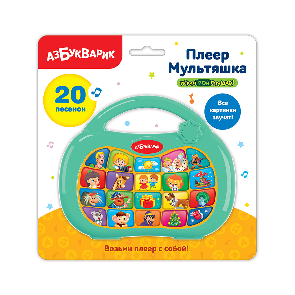 Нажимай на картинки – мультяшки споют весёлые песенки: "Ничего на свете лучше нету", "Антошка", "Добрый жук", "Чунга-чанга", "Весёлая карусель" и др. Всего 20 любимых песенок из мультиков! Оригинальная форма понравится малышам и их родителям. Возьми плеер за ручку и носи с собой.