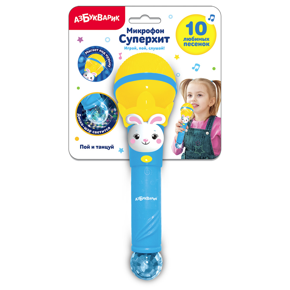 Что нужно для зажигательной детской дискотеки? Конечно, большой микрофон Суперхит с популярными детскими песенками и светомузыкой. Нажимай на кнопочку – слушай 10 веселых песенок и потешек: