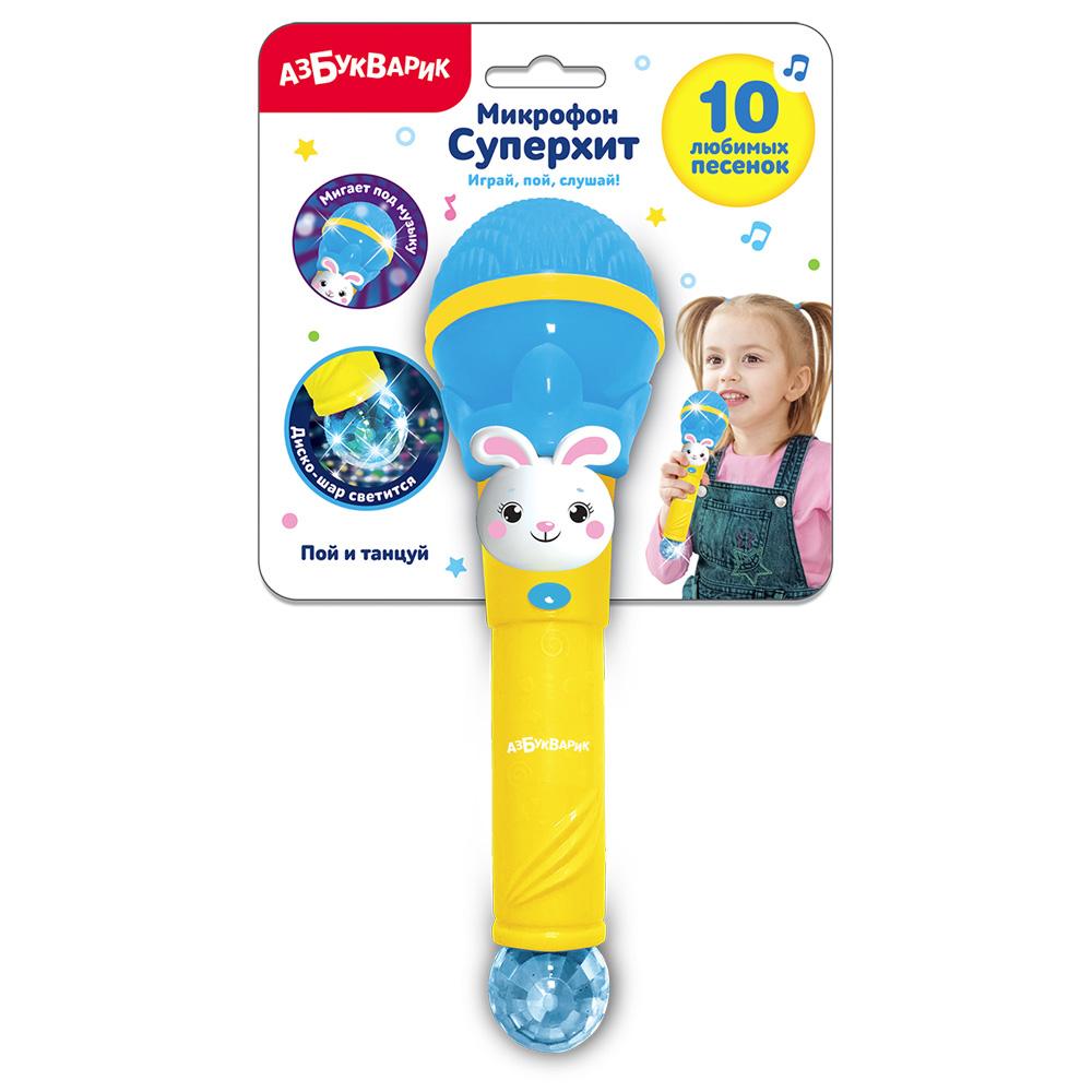 Что нужно для зажигательной детской дискотеки? Конечно, большой микрофон Суперхит с популярными детскими песенками и светомузыкой. Нажимай на кнопочку – слушай 10 веселых песенок и потешек:
