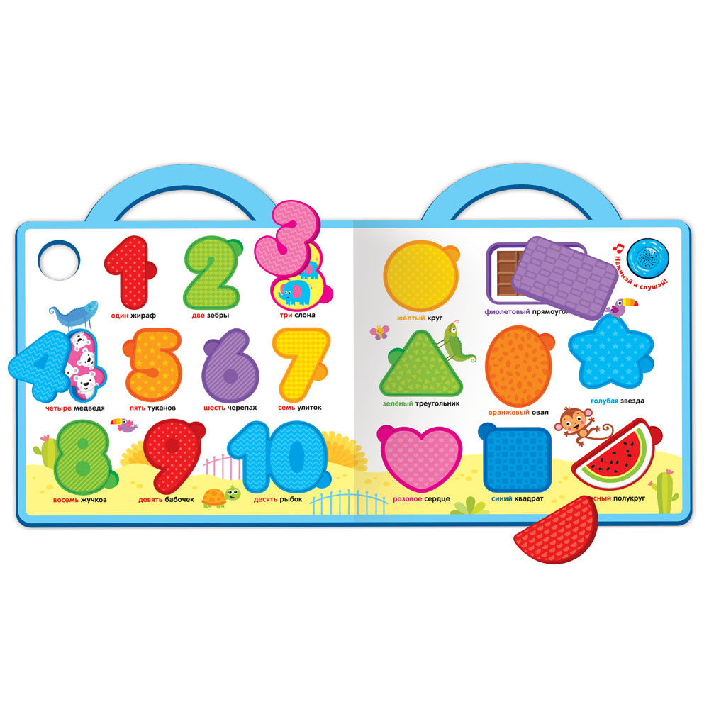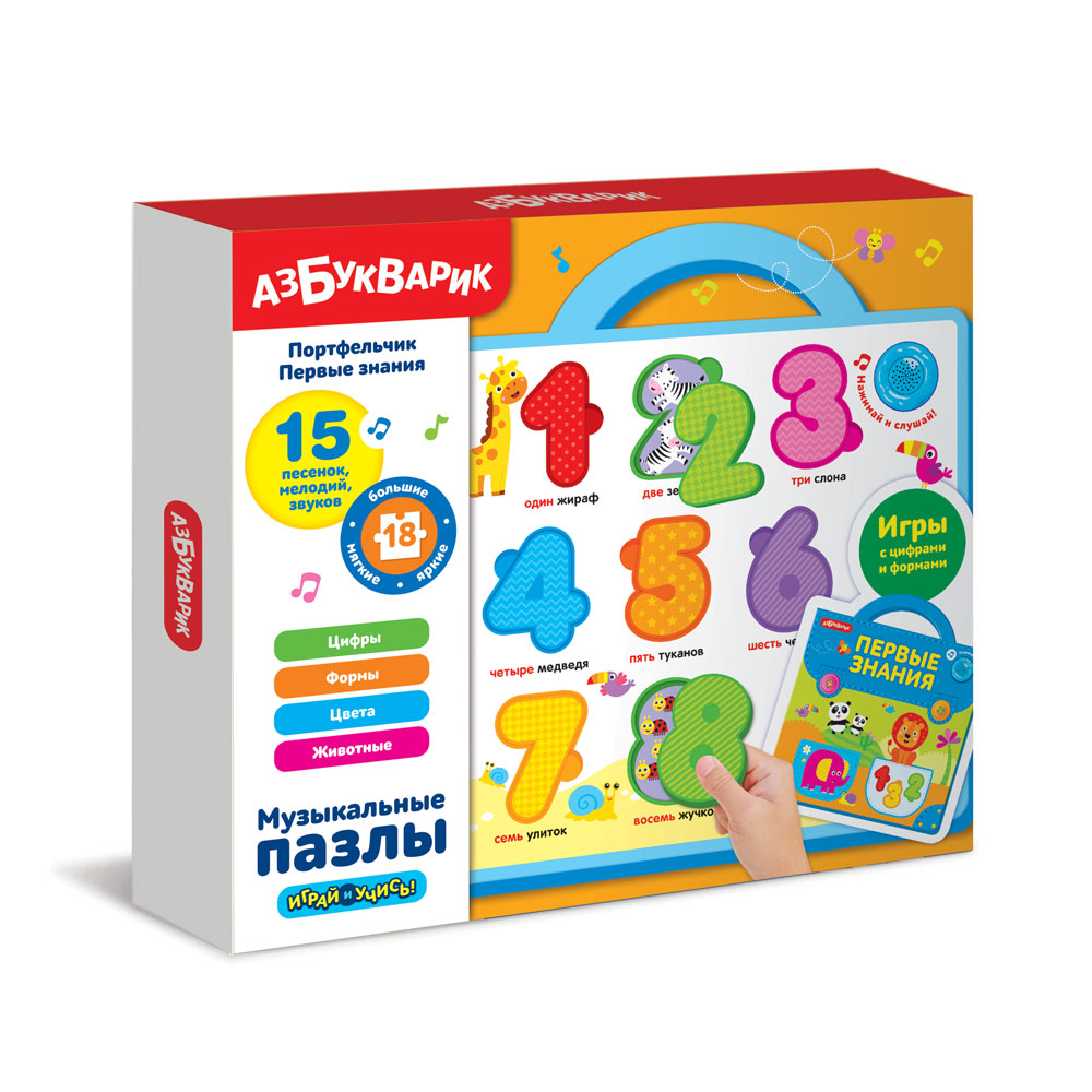 С таким портфельчиком дошкольник поскорей захочет пойти в первый класс! Портфельчик стильный, яркий, из легкого материала EVA, а самое главное – в нем есть все необходимые знания. Вставляя мягкие фигурки в нужные окошки, малыш будет учить цифры, формы и цвета, познакомится со зверюшками. Родители могут поиграть вместе с ребенком в обучающие игры: считалочка, угадайка «Формы и цвета» и т.д. Такие занятия развивают память, логическое мышление, мелкую моторику. Фигурки разной формы можно использовать как трафареты при рисовании, что способствует развитию творческого воображения. А обучающие песенки про цифры, формы, цвета и веселые мелодии помогут закрепить новые знания.