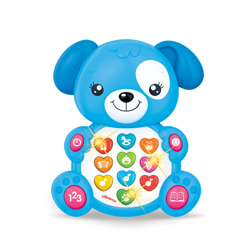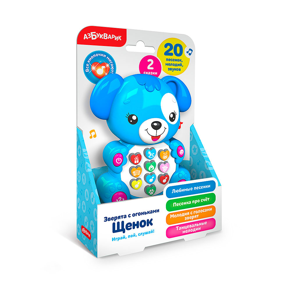 Малыш обязательно подружится с этим милым щенком! Игрушку отличает разнообразное содержание: вместе с ней ребёнок будет петь любимые песенки и потешки ("Пусть бегут неуклюже", "Весёлая карусель", "Добрый жук", "Антошка", "Два весёлых гуся", "Идёт коза рогатая"), танцевать под весёлые мелодии, слушать сказки("Колобок", "Гуси-лебеди") и даже выучит счет до пяти с обучающей песенкой! Таким образом, игрушка не только развлекает малыша, но и развивает его музыкальные и танцевальные способности, расширяет кругозор.