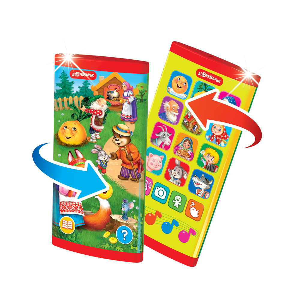 Двусторонний смартфончик «Сказки для малышей» – это интерактивная игрушка для современных детей. Играть с этим смартфончиком вдвойне интересно – ведь теперь нажимать на звуковые кнопочки можно с двух сторон! Кроху порадуют 3 русские народные сказки («Колобок», «Репка», «Курочка Ряба»), 24 песенки («Водичка», «Антошка», «Калинка», «Серенький козлик», «Тень-тень, потетень», «Баюшки», «Вышел зайчик погулять», «Волк-волчок» и др.), множество вопросов и загадок, танцевальные мелодии и забавные звуки! А весёлые игры со сказочными персонажами развивают фантазию и сообразительность.