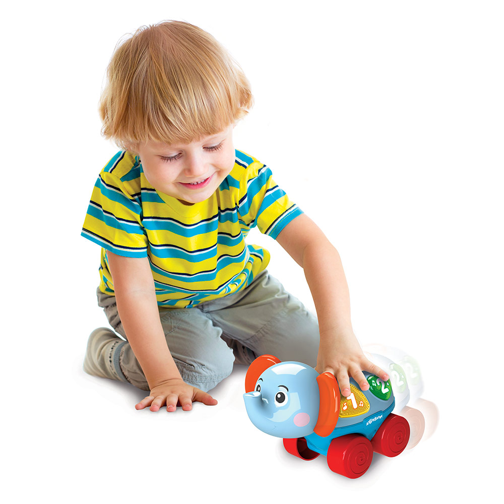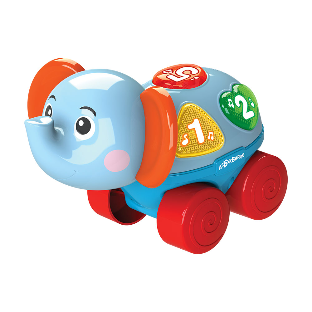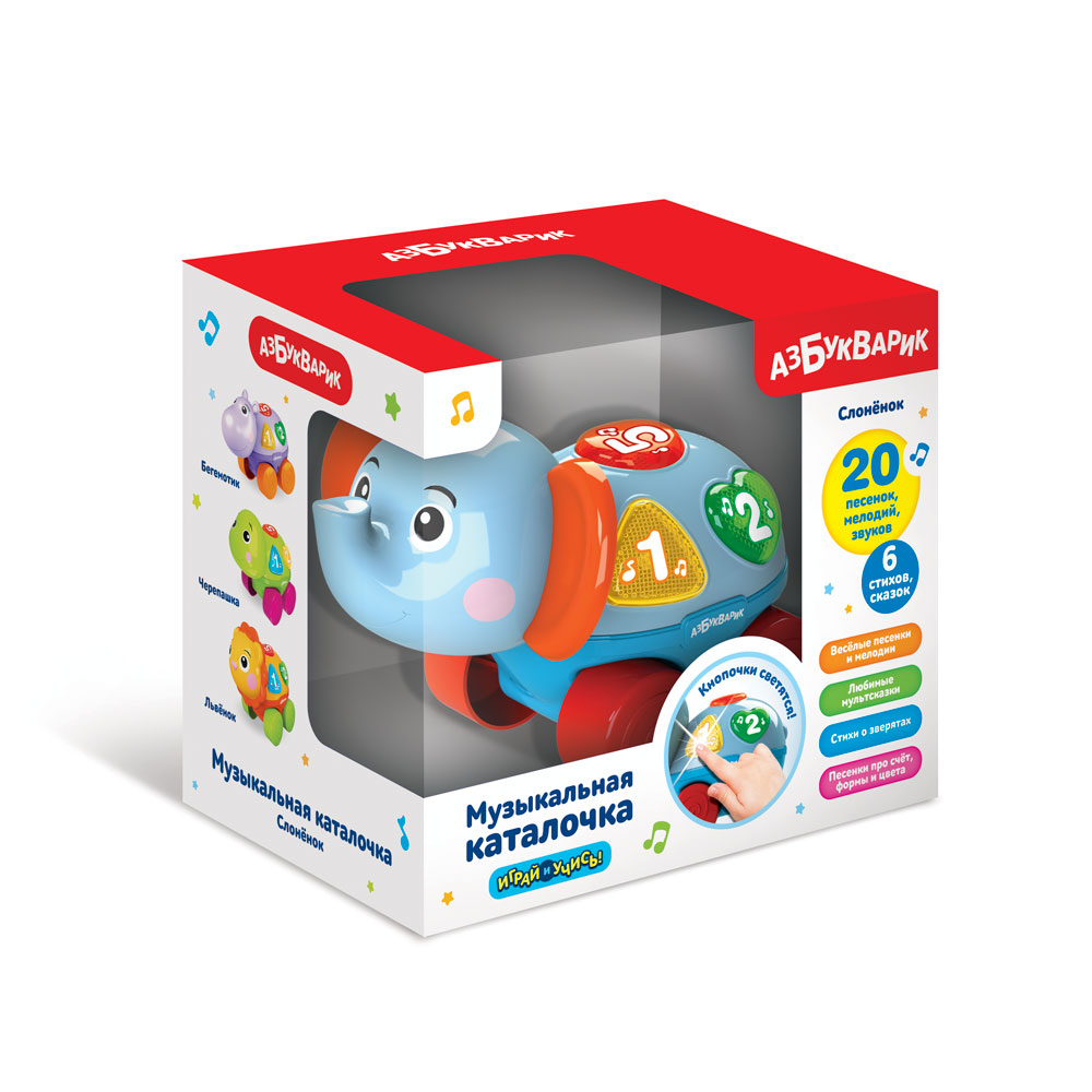 Малыш будет в восторге от своего нового друга на колесиках – слоненка! На спине у него – разноцветные фигурные кнопочки с огоньками. Нажимая на кнопки, ребенок послушает любимые сказки со множеством звуков («Мама для Мамонтенка», «Марусина карусель»), обучающие песенки про счет, формы и цвета, хиты из мультиков, танцевальные мелодии и стихи о зверятах. И конечно, под музыку так весело катать бегемотика и бегать за ним!