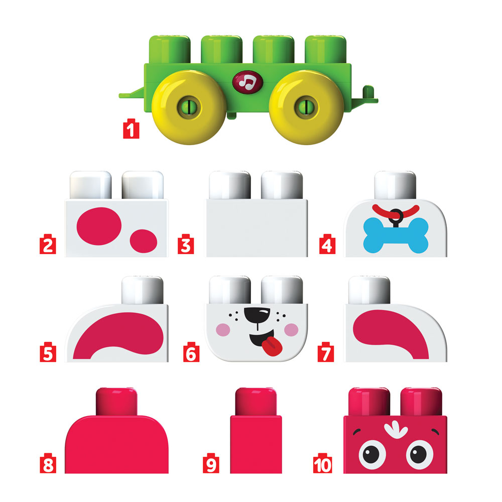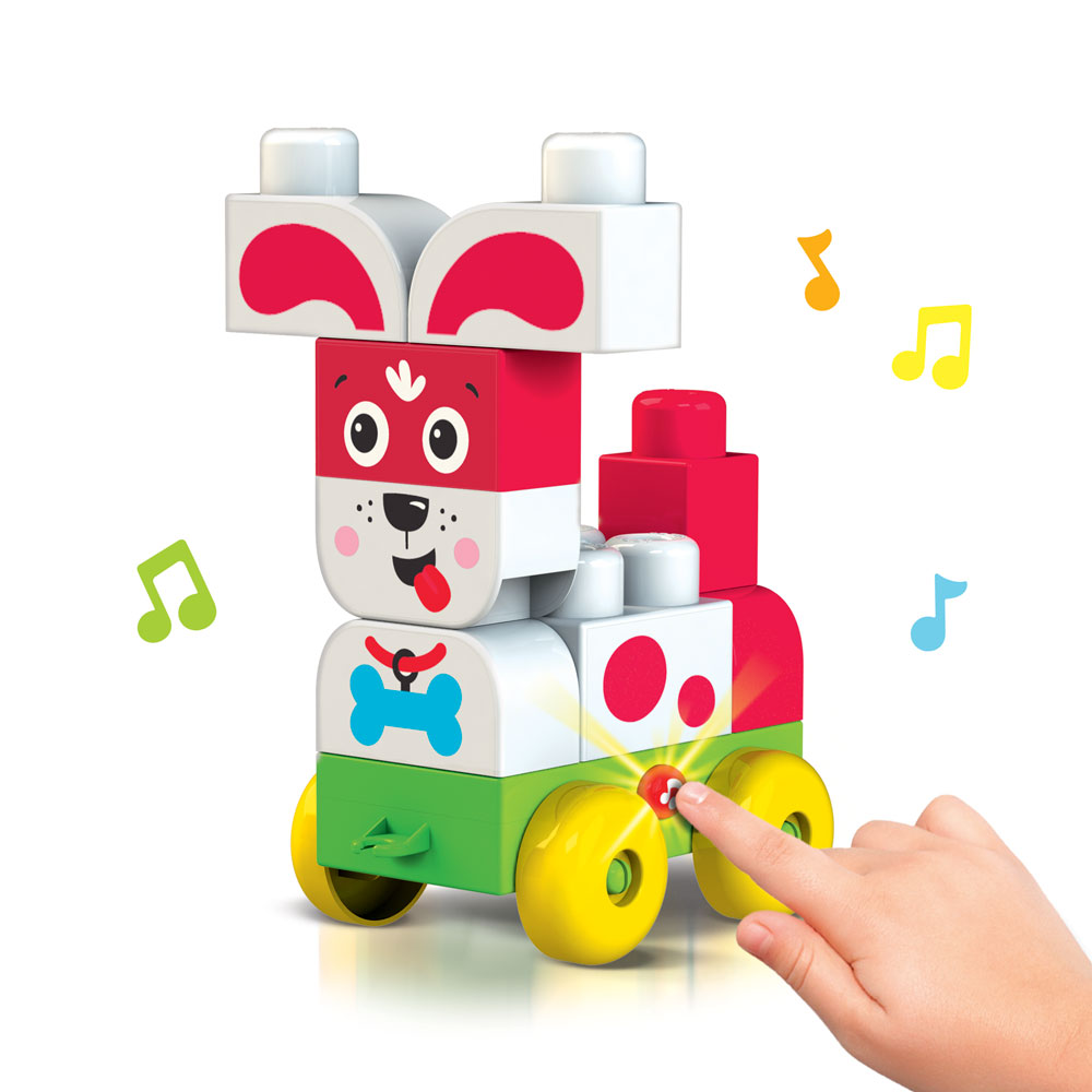 В игровом наборе «Собачка» малыш найдет 10 крупных деталей, среди которых 9 кубиков с картинками и музыкальная каталочка. Собери на музыкальной платформе-каталочке забавную собачку, нажми на нотку – игрушка оживет! Катай игрушку, слушай 10 песенок, мелодий и звуков.