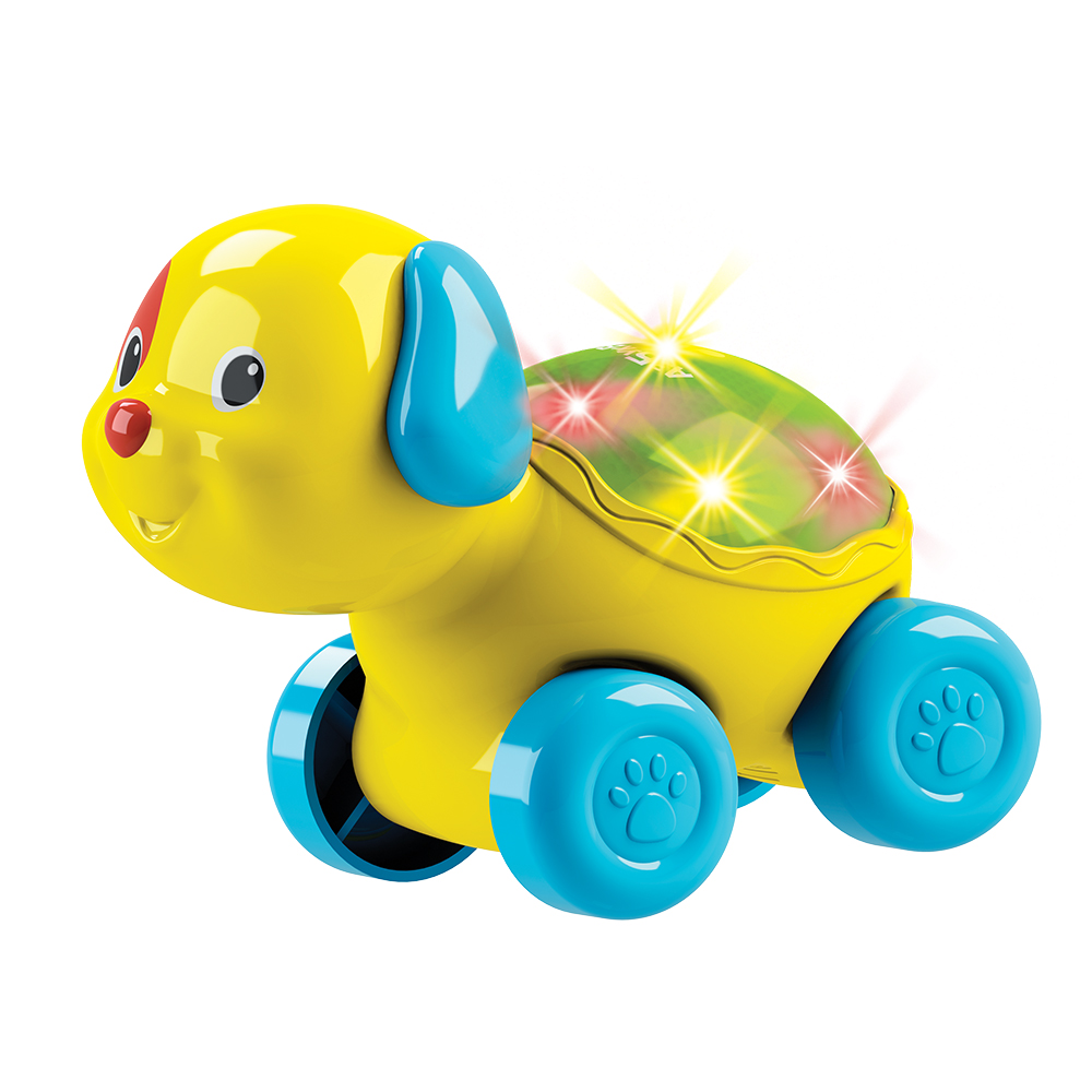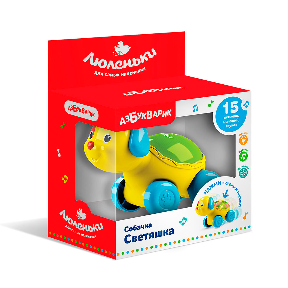 Эту милую собачку не просто так зовут Светяшкой! Она вся светится разноцветными огоньками – малышу нужно только нажать ладошкой на спинку игрушки. Собачка Светяшка – музыкальная: она поет 6 веселых песенок и мелодий («Песенка про ферму», «Стало солнышко теплей», «Топ-топ, топотушки», «Весёлая карусель» «Немецкая полька», «Чижик-пыжик»). А еще у собачки есть колесики, и ребенок сможет покатать ее.