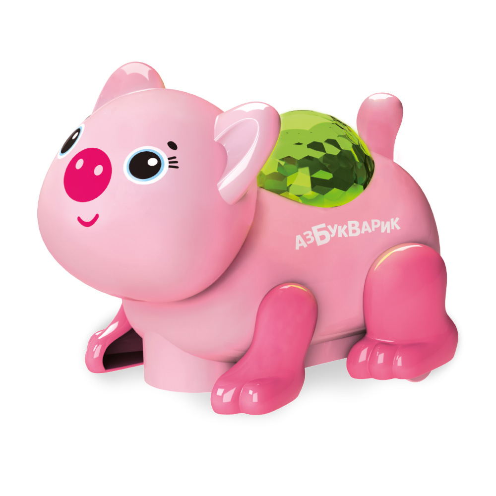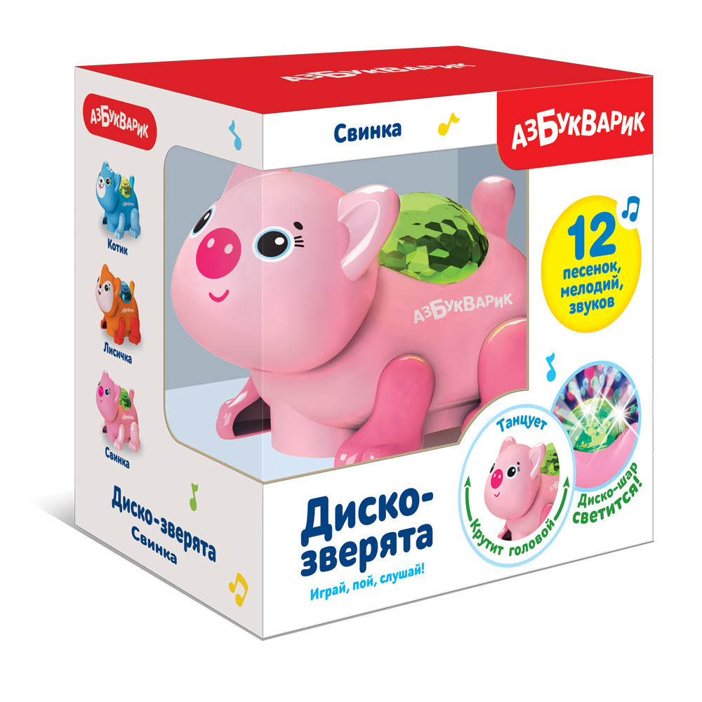 Диско-зверята приглашают на детскую вечеринку! Симпатичная свинка задорно танцует под музыку – малышу захочется потанцевать с ней вместе! Нужно просто включить игрушку – и зазвучат веселые песенки и мелодии с забавными звуками («Если нравится тебе, то делай так», «Антошка», «Пляшут весело детишки», «Арам зам зам», «Песенка про кузнечика», «Собачий вальс», «Танцевальная мелодия»). Свинка крутит головой под музыку, а на спинке у нее есть настоящий диско-шар, который светится разноцветными огоньками.