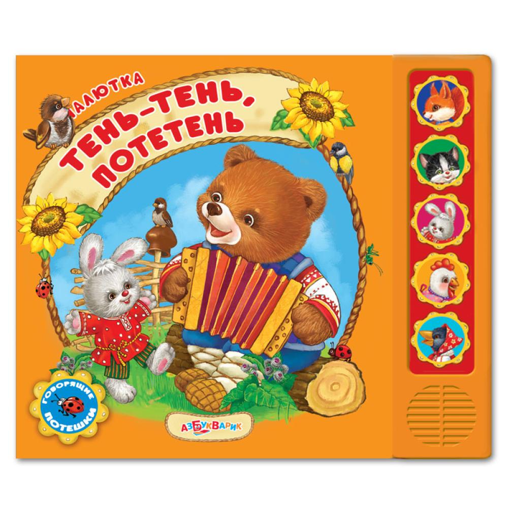 В этой красочной книжке малышей ждут 5 весёлых стихов-потешек: «Сидит белка на тележке», «Как у нашего кота», «Тень-тень, потетень», «Тили-бом», «Сорока-ворона». Эта книжка рассчитана на самых маленьких, поэтому, чтобы послушать стихотворение, нужно просто нажать на кнопочку на ярком звуковом модуле.