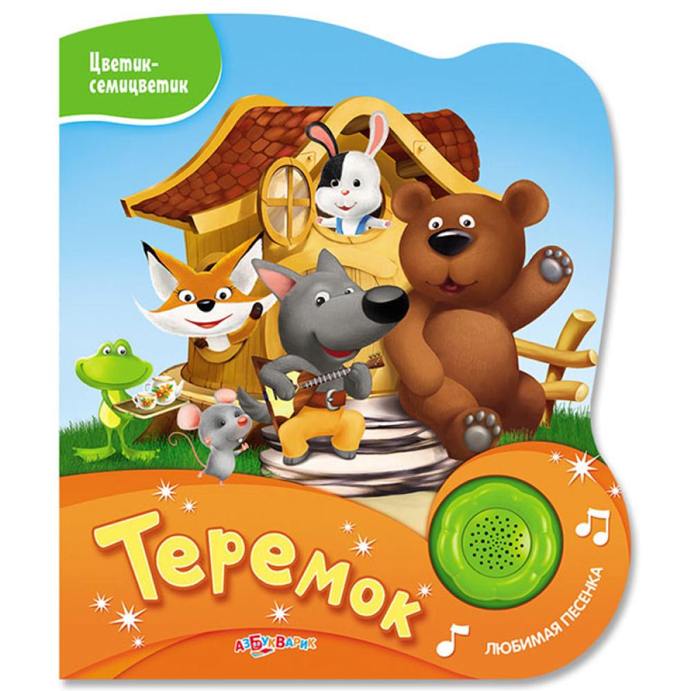 Добрая сказка «Теремок» с яркими персонажами и красочными картинками не оставит малышей равнодушными. А при нажатии на кнопочку-цветочек зазвучит весёлая песенка про теремок.