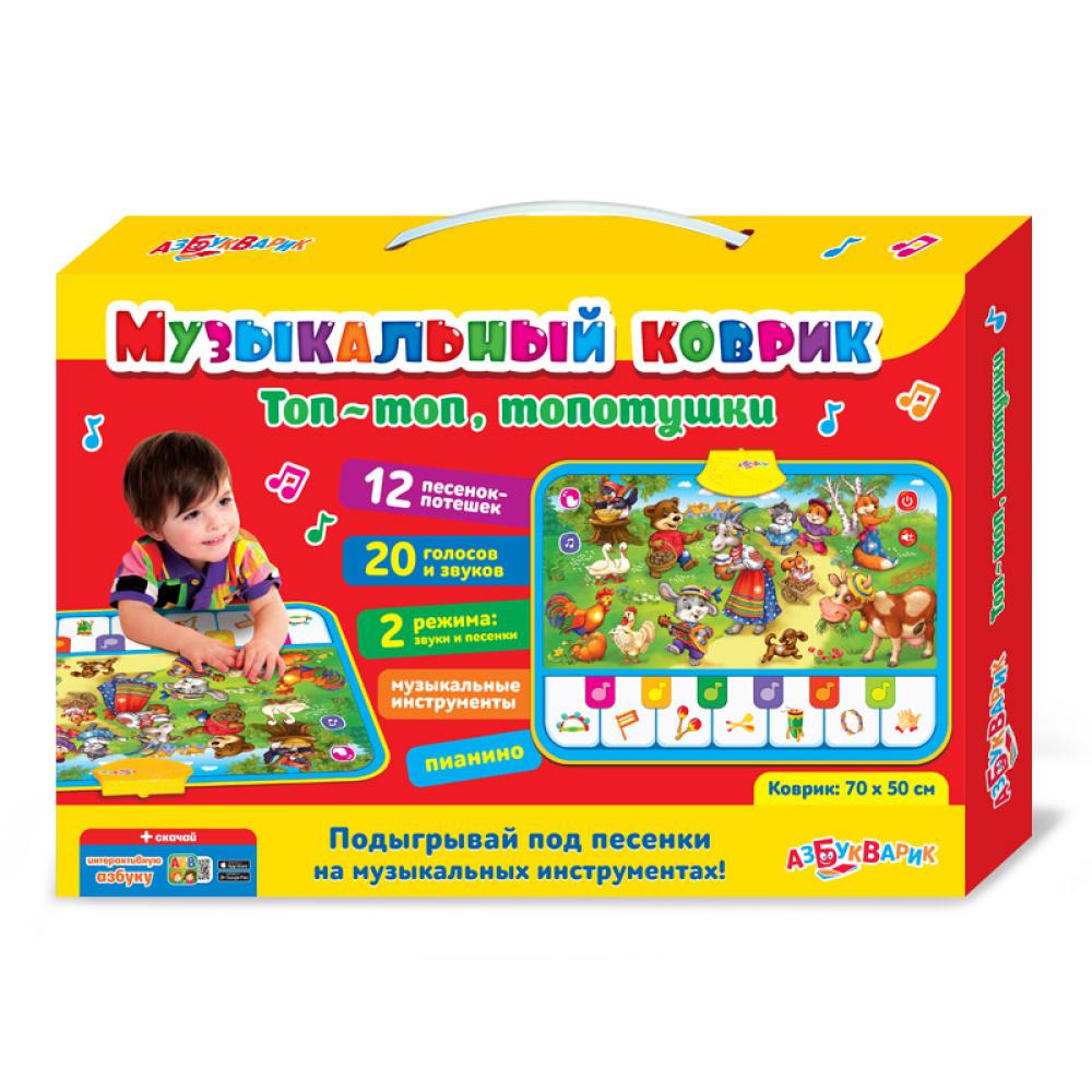 Азбукварик представляет новое направление игрушек – музыкальные коврики! Коврик «Топ-топ, топотушки» разработан специально для малышей. В нем собраны лучшие песенки-потешки, которые поют весёлые зверюшки: «Сорока-белобока», «Петушок», «Ладушки», «Идёт коза рогатая», «Раным-рано поутру», «Топ-топ, топотушки», «Мишка косолапый», «Кошкин дом», «Заинька, попляши!», «Два весёлых гуся», «Тень-тень, потетень», «Сидит белка на тележке».