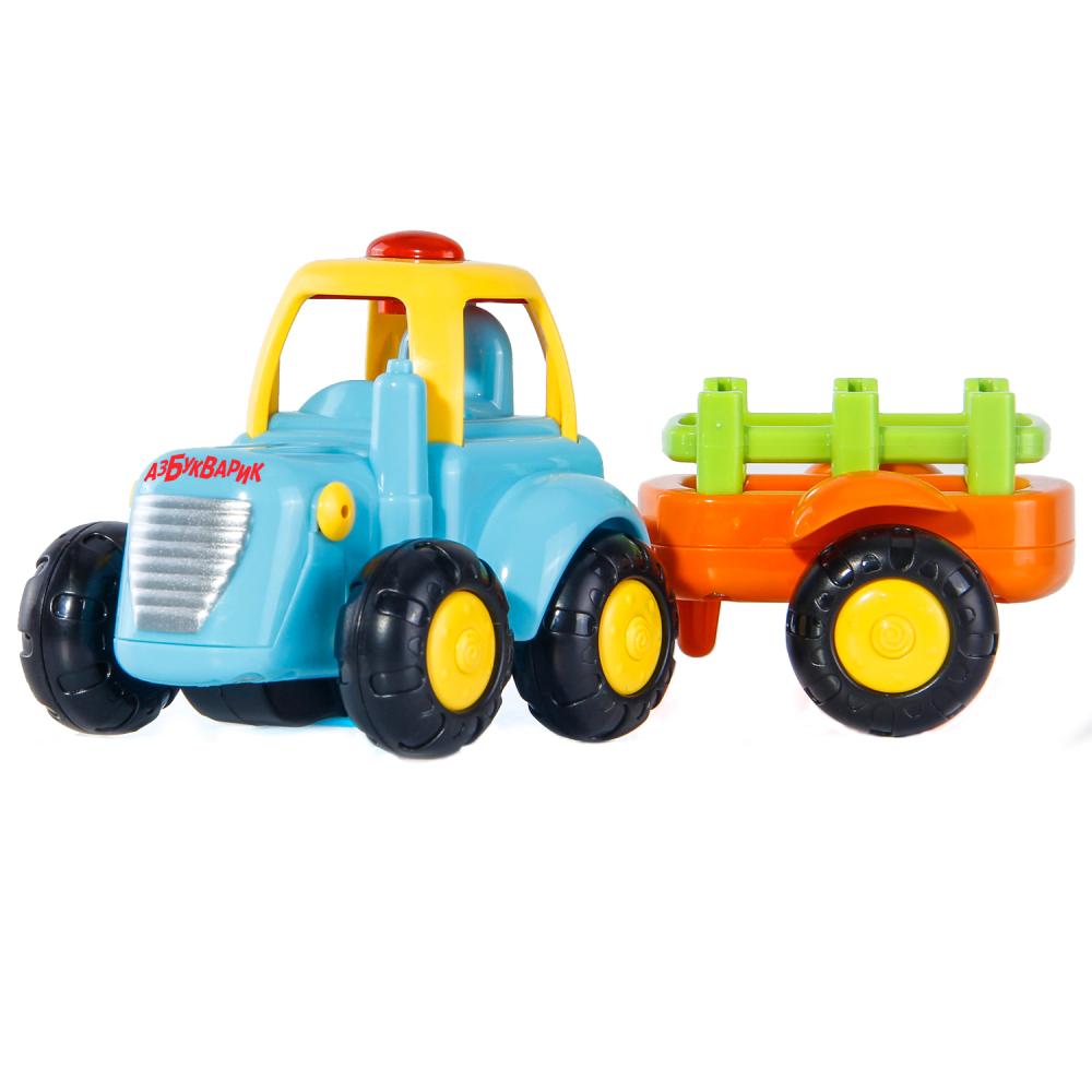 Забавный разноцветный трактор ездит, мигает огоньками, проигрывает веселую песенку и задорно «бибикает». Музыка и световые эффекты включаются при движении, а слова песенки помогут крохе быстро выучить счет до пяти. Поставьте игрушку на пол, включите, и ребенок будет с большим удовольствием ползать за веселой машинкой, которая ездит благодаря работе инерционного механизма. У самосвала есть съемный прицеп – малыш это обязательно оценит!