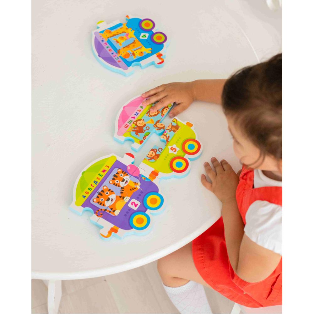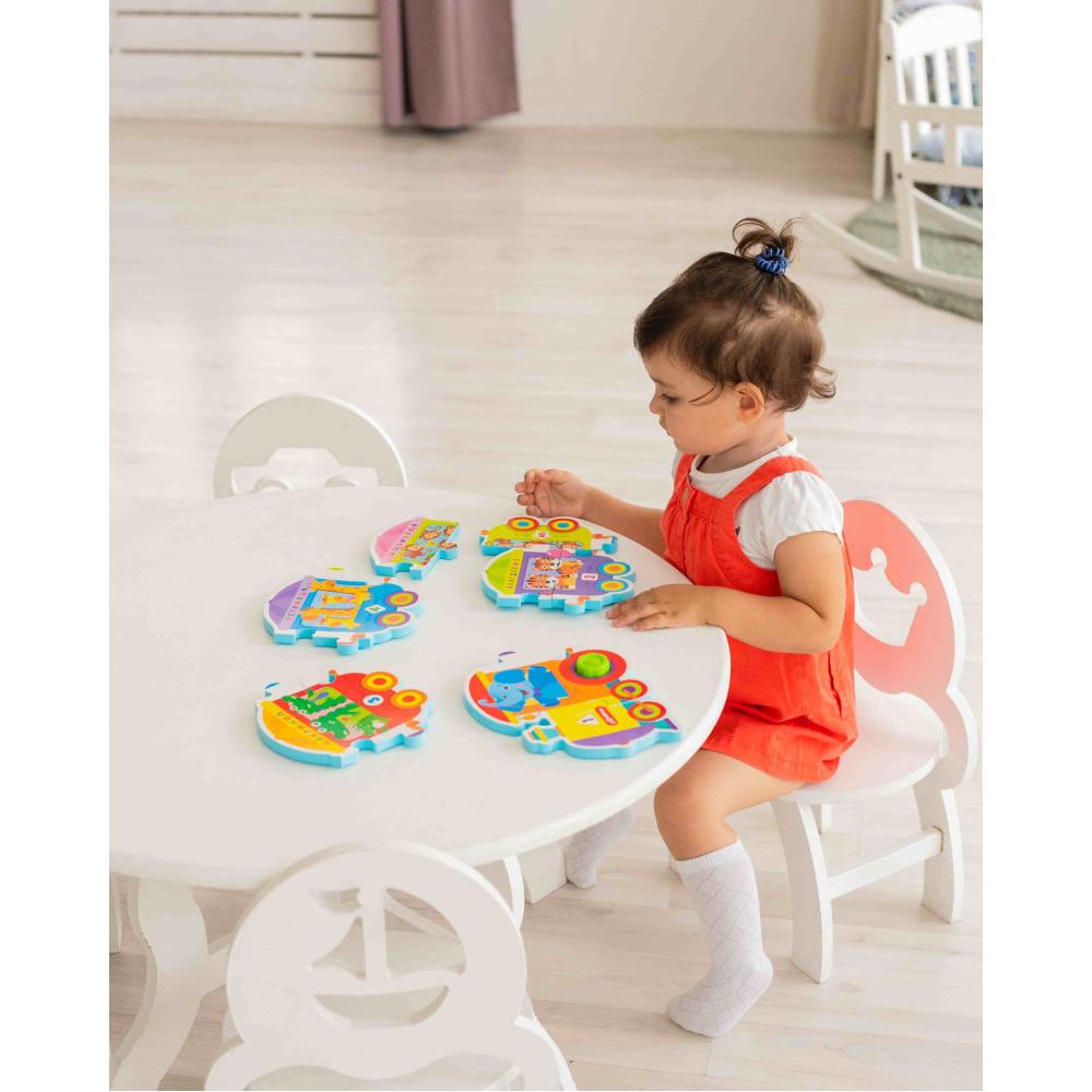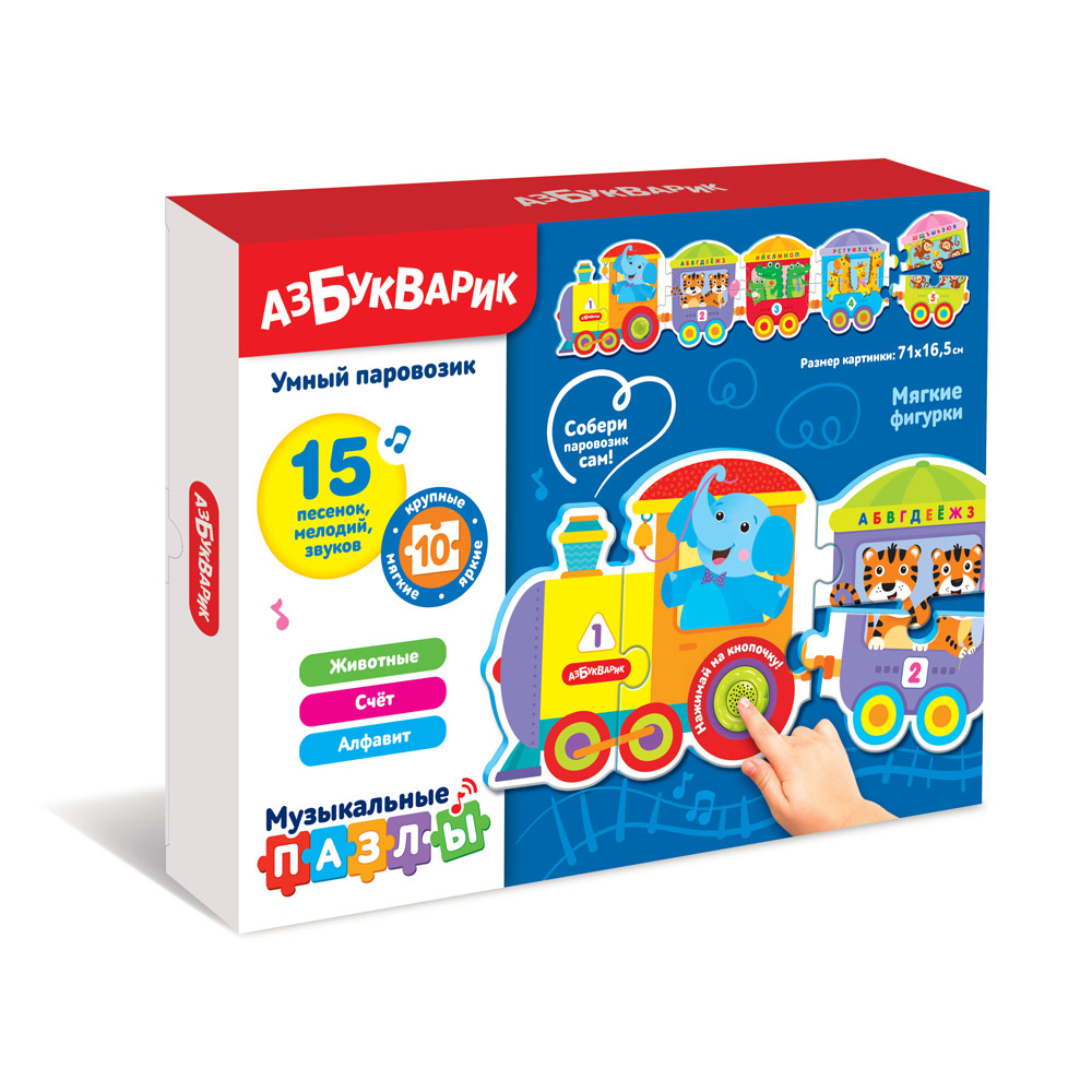 Играть с пазлами не только интересно, но и полезно для малыша! Это занятие развивает логику, мышление, внимание, мелкую моторику. В игровом наборе «Музыкальные пазлы. Умный паровозик» ребенок найдет 10 крупных ярких деталей, из которых он сможет собрать большой поезд! Главное – расположить вагончики правильно, ведь на каждом из них есть свой номер! Во время игры малыш сможет выучить буквы и цифры, посчитает зверят в вагончиках.