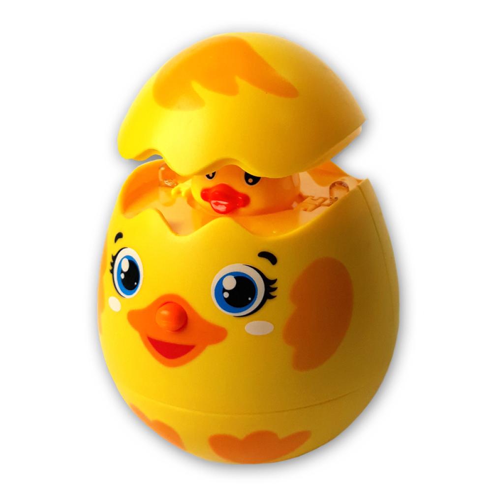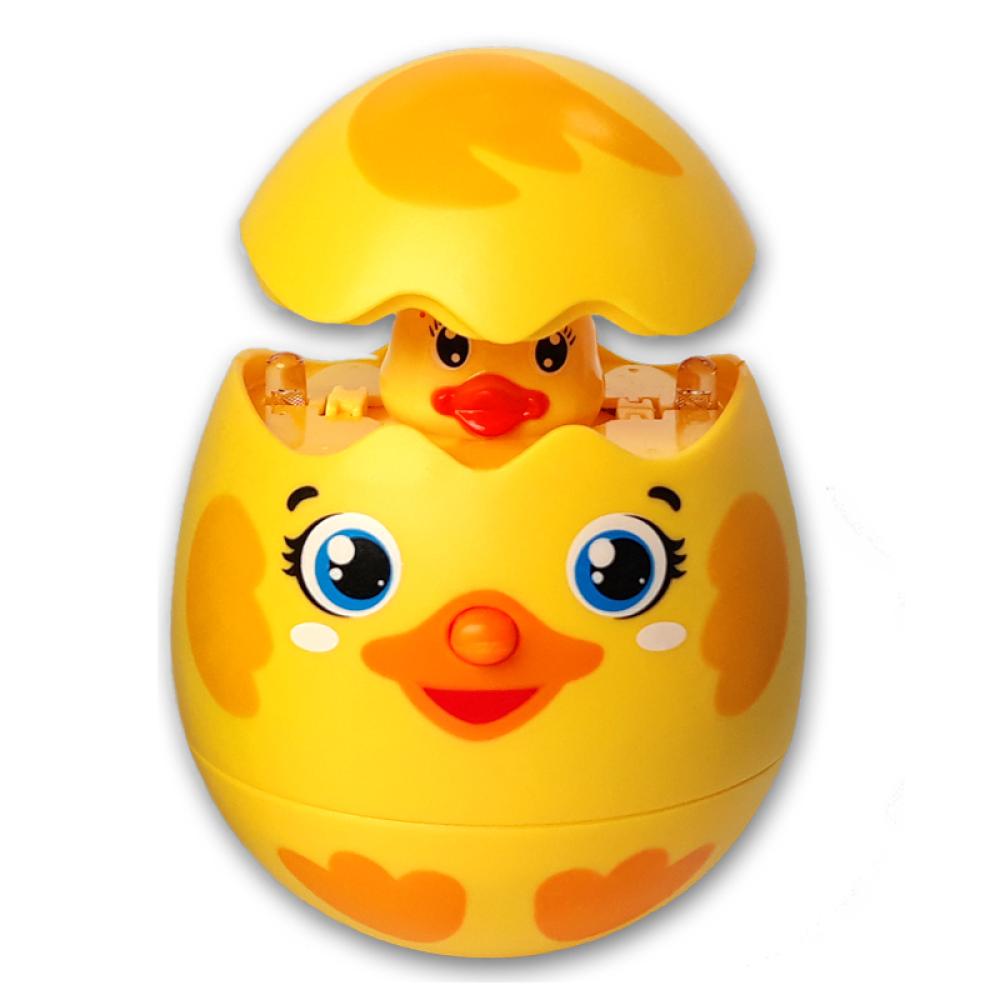 Нажми на кнопочку - из яйца выпрыгнет утёнок и порадует забавными фразами и песенками "Два весёлых гуся", "Танец утят"!