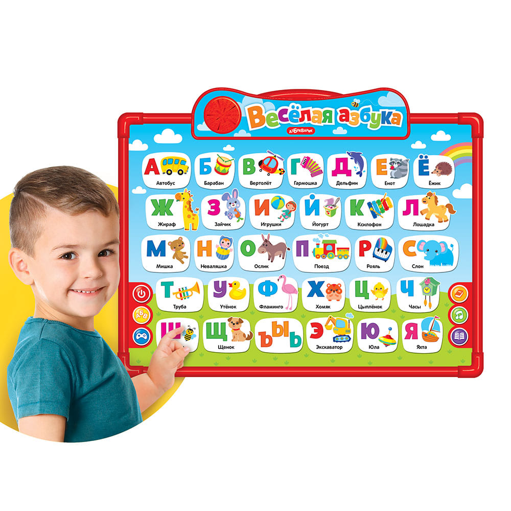 Интерактивная двусторонняя говорящая доска – для веселого современного обучения! Первая сторона – «Нажимай и учись». Все картинки – говорящие! Нажимай – учи и слушай буквы, слова, стихи и забавные звуки! Чтобы учиться было интереснее – послушай весёлые песенки («Песенка про алфавит», «Если весело живётся, делай так», «Чунга-чанга», «Стало солнышко теплей», «Антошка», «Пляшут весело детишки», «Наши друзья») и 3 любимые сказки («Заюшкина избушка», «Три медведя», «Пузырь, соломинка и лапоть»).