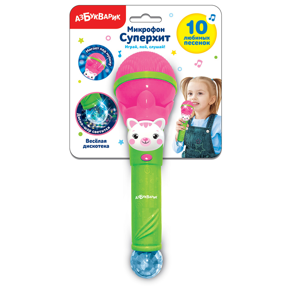 Что нужно для зажигательной детской дискотеки? Конечно, большой микрофон Суперхит с популярными детскими песенками и светомузыкой. Нажимай на кнопочку – слушай 10 веселых песенок из мультиков: