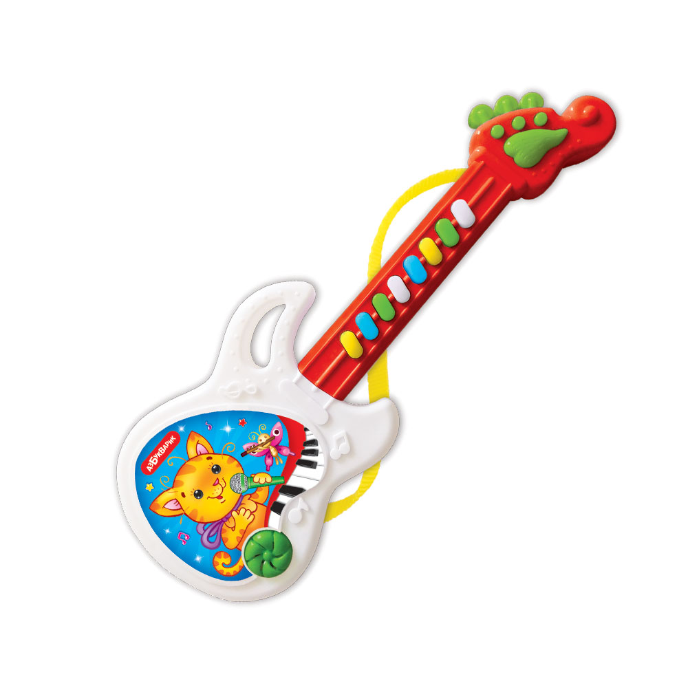 С такой гитарой малыш почувствует себя не простым музыкантом, а настоящей рок-звездой. Ее дизайн и форма – как у настоящей гитары для профессионалов. Нажимая на разноцветные кнопочки на грифе гитары, ребенок послушает детские хиты в современной аранжировке – 8 песенок («Два весёлых гуся», «Лошадка», «Щенок», «Какой чудесный день!», «Весёлая карусель», «Весёлые путешественники», «Песня Львёнка и Черепахи», «Чунга-чанга») и 8 мелодий («Танец маленьких утят», «Песенка фермера», «Собачий вальс», «Песенка про кузнечика», «Калинка», «Чижик-пыжик», «Улыбка», «Арам зам зам»). Устроить концерт для семьи и друзей – это так весело! Благодаря яркому ремешку гитару удобно всюду носить с собой.