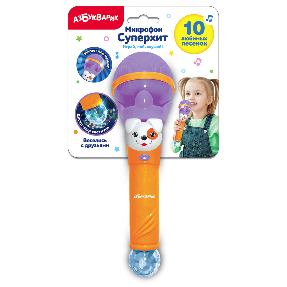 Что нужно для детской зажигательной дискотеки? Конечно, большой микрофон Суперхит с популярными детскими песенками и светомузыкой. Нажимай на кнопочку – слушай 10 песенок из мультиков:
