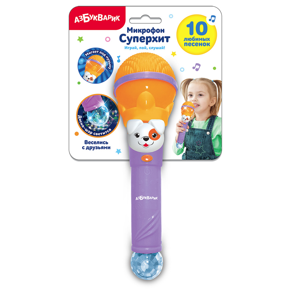 Что нужно для детской зажигательной дискотеки? Конечно, большой микрофон Суперхит с популярными детскими песенками и светомузыкой. Нажимай на кнопочку – слушай 10 песенок из мультиков: