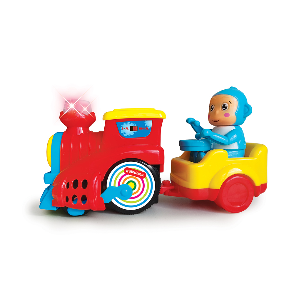 Веселый паровозик едет сам – и ему не нужны рельсы! Просто включи игрушку – и вперед! Паровозик гудит и стучит колесами, как настоящий, поет веселые и познавательные песенки, играет мелодии с веселыми звуками, а еще у него светится труба! В поезде едет пассажир – забавная обезьянка, она играет на барабане и крутит головой. Малыш сможет подпевать песенки про алфавит и счет, бегать за паровозиком, играть и веселиться! Вагончик с обезьянкой можно прицеплять и отцеплять по желанию.