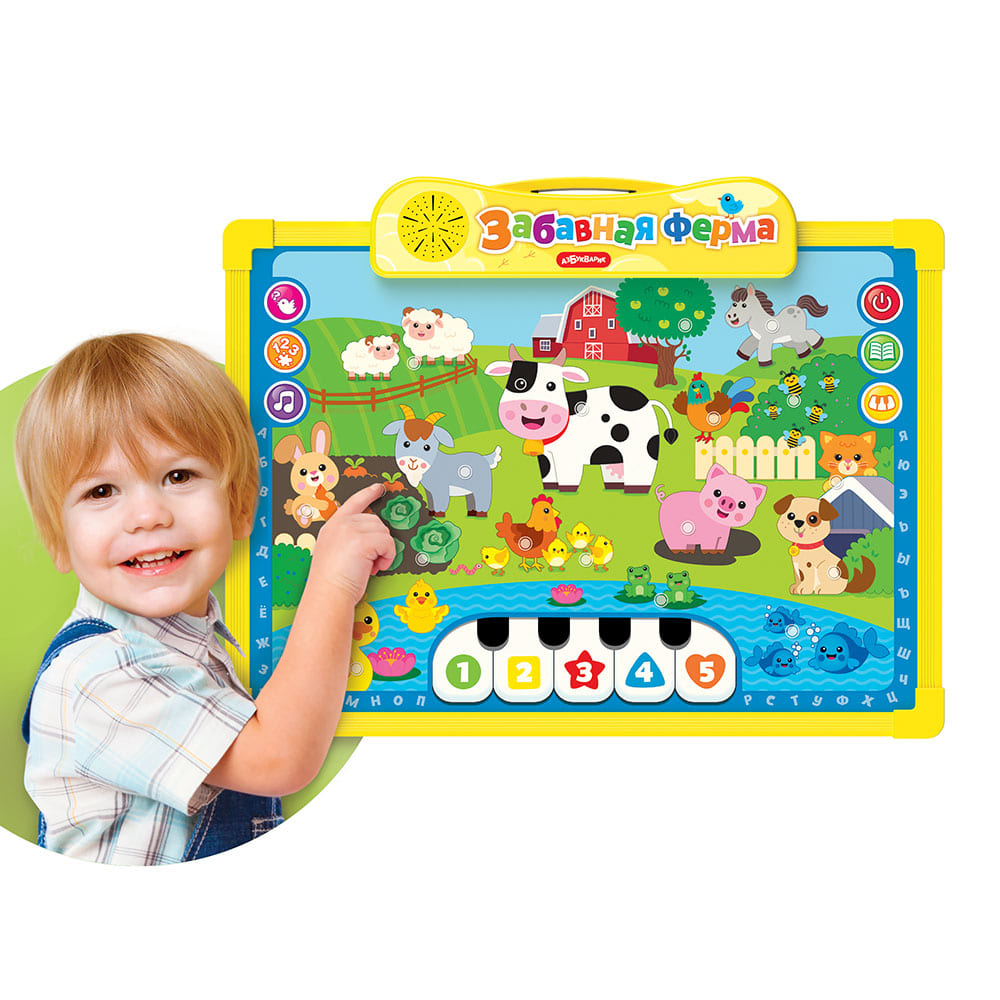 Первая сторона – «Нажимай и учись». Все картинки – говорящие! Нажимай, знакомься с животными фермы, учи цифры, формы и цвета. Чтобы учиться было интереснее – послушай 15 песенок зверят, 5 обучающих песенок и 3 любимые сказки («Курочка Ряба», «Репка», «Коза-дереза»), сыграй на волшебном пианино 10 мелодий.