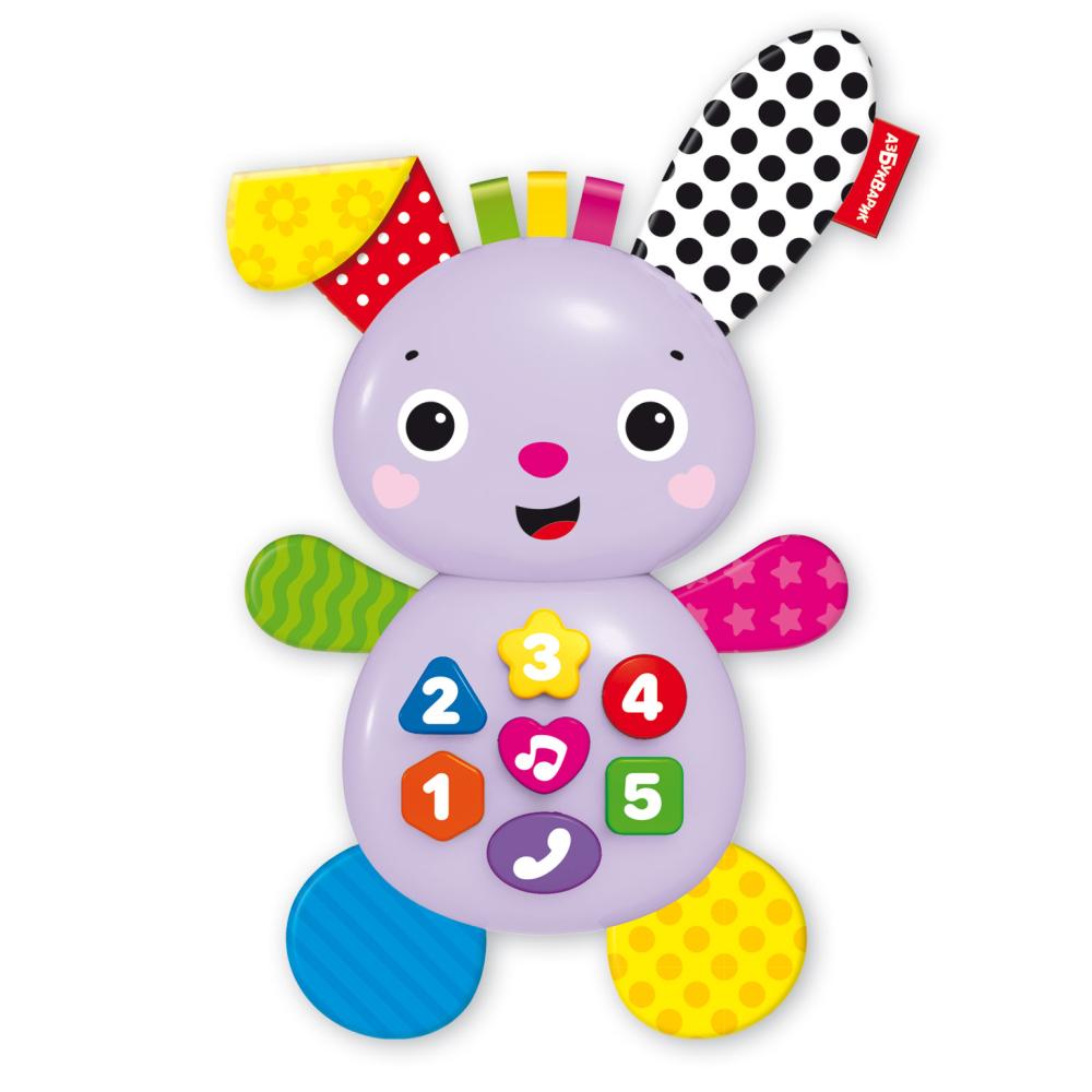 Милый зайка станет для малыша не просто любимой игрушкой, а хорошим другом! Нажимая на кнопочки, ребенок сможет послушать 30 звуков, фразочек, песенок («Как чудесно жить на свете», «Что такое праздник?», «Как хорошо все цифры знать», «Это что за чудеса?», «Быстро выучим цвета», «Пляшут весело детишки»), выучить цифры, формы и цвета, поиграть в телефончик. Огоньки на кнопочках мигают под музыку и создают ощущение праздника. А еще у щенка мягкие лапки и шуршащие ушки, которые так приятно трогать!