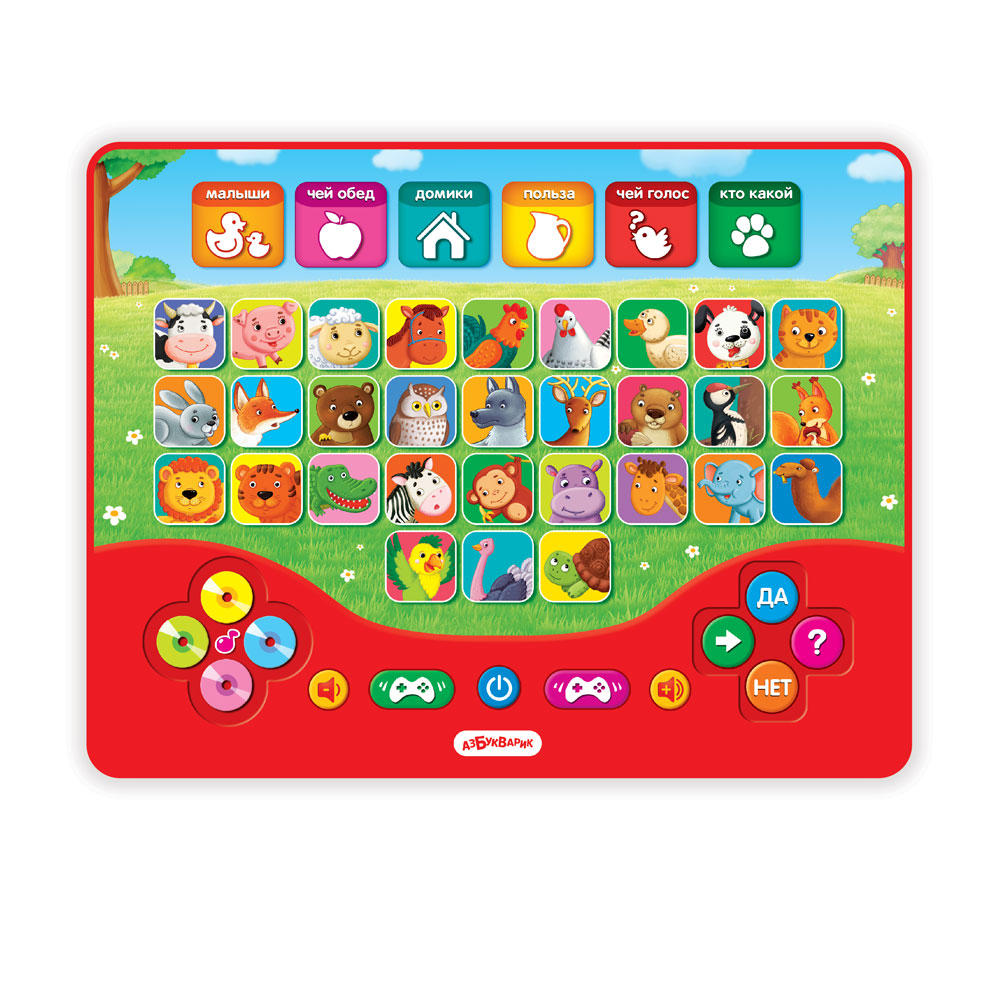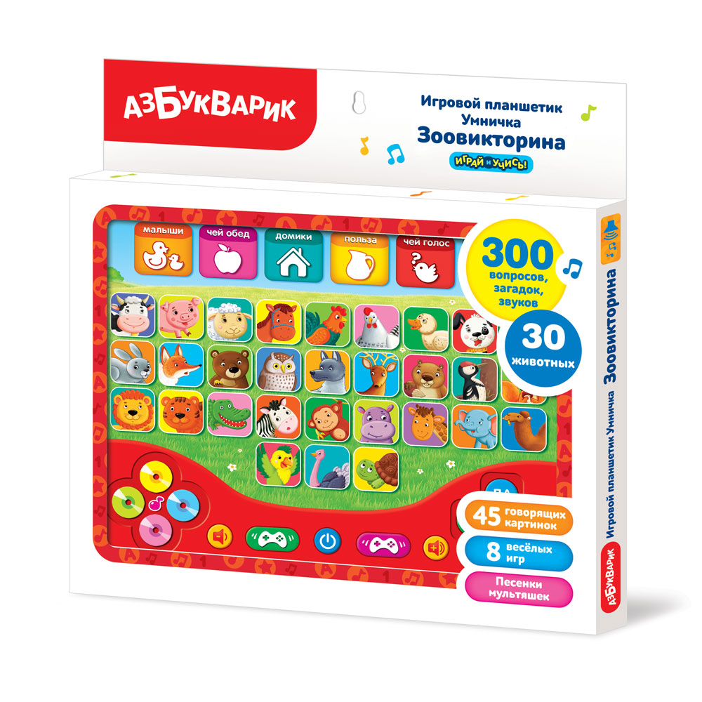 Ваш малыш хочет знать всё о животных? Тогда пусть попробует выиграть Зоовикторину вместе с новым игровым планшетиком! В нем собрано более 200 вопросов и загадок о зверюшках фермы, леса и зоопарка. Выбирай одну из 8 увлекательных игр: "Весёлая викторина", "Да-нет", "Чей малыш", "Чей домик", "Чей обед", "Чей голос", "Какая польза", "Кто какой".